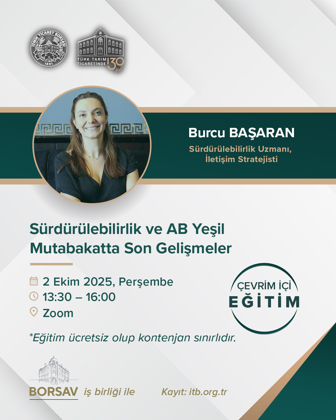 Avrupa Yeşil Mutabakatı, ticaretten üretime, lojistikten tarıma kadar tüm sektörleri etkileyen kapsamlı bir dönüşüm sürecini beraberinde getiriyor. Bu eğitimde, sürdürülebilirliğin iş dünyasındaki stratejik önemini yeniden ele alacak; Yeşil Mutabakat kapsamında öne çıkan güncel başlıkları, mevzuat gelişmelerini, Türkiye’deki etkilerini ve İTB üyeleri için olası risk ve fırsatları birlikte değerlendireceğiz.